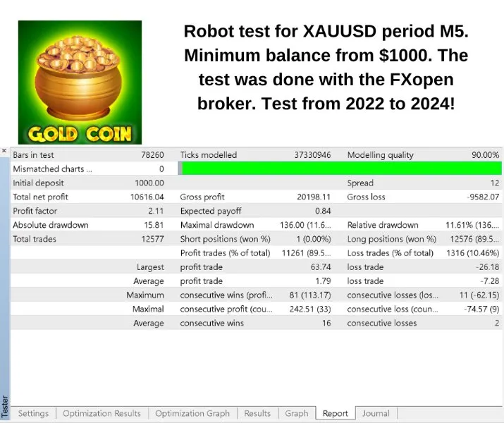 Gold Coin M5 คือ หุ่นยนต์ซื้อขายอัตโนมัติที่ออกแบบมาเพื่อซื้อขายในตลาดทองคำ (XAUUSD) โดยใช้ช่วงเวลา M5 หุ่นยนต์นี้ได้รับการออกแบบสำหรับผู้ซื้อขายที่ต้องการซื้อขายโดยอัตโนมัติในช่วงเวลาสั้นๆ (การเก็งกำไรระยะสั้น)
